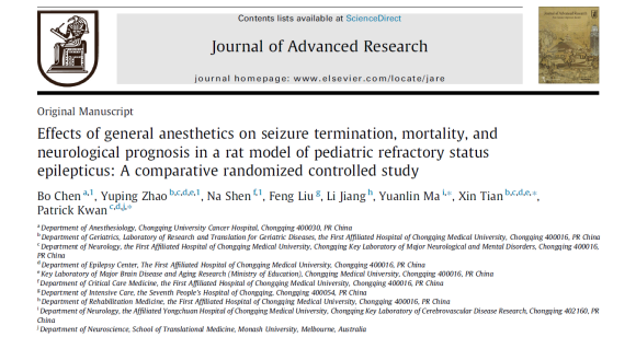 近日,一项由重庆大学附属肿瘤医院麻醉科陈博医生作为第一作者,联合重庆医科大学附属第一医院癫痫中心、重庆医科大学附属永川医院脑血管病研究重点实验室及澳大利亚蒙纳士大学,在国际知名期刊《Journal of Advanced Research》(JCR 1区,中科院1区,Top期刊,影响因子13.0)上发表重要研究成果。该研究首次通过严谨的随机对照动物实验,系统比较了五种常用全身麻醉药治疗难治性癫痫持续状态的综合表现,为这一临床难题的突破提供了关键科学依据。